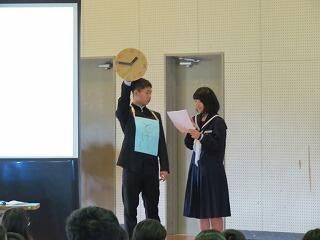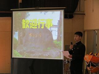 4月16日(火)新入生歓迎行事が行われました。生徒会役員が1年生に生徒会活動や1日の流れについて、劇を交えながら分かりやすく説明してくれました。また、部活動紹介では各部元気のよい紹介をしていました。先輩方の楽しい発表に1年生も笑顔になっていました。
