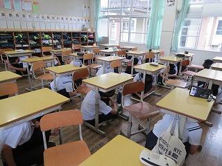雨のため体育館への避難になりましたが、本当に地震が来たときを考えて、真剣に取り組んでいました。また、体育館集合後は地震に関するDVDを観て、災害の怖さについて知ることができたようです。