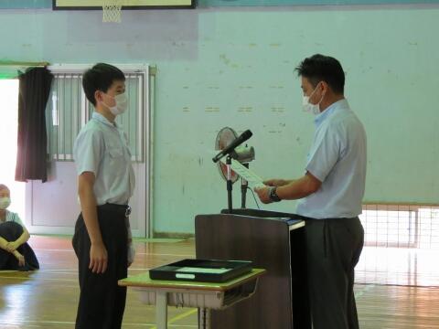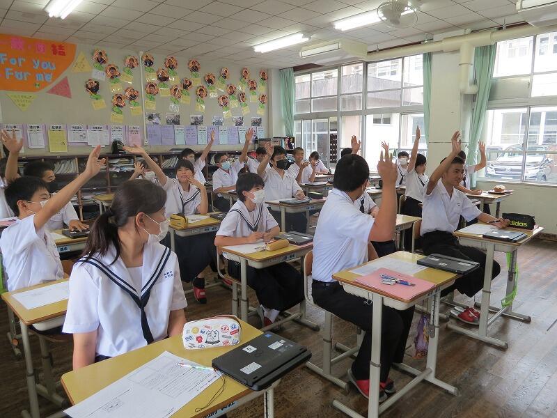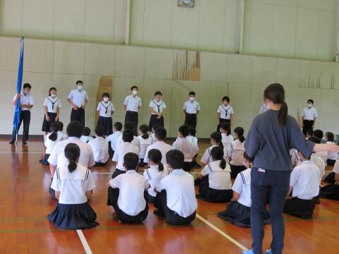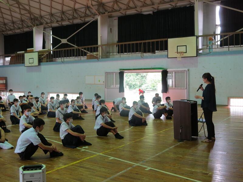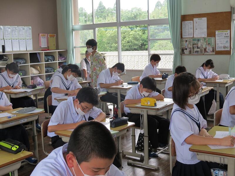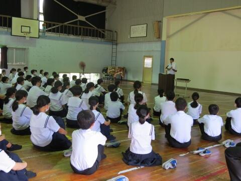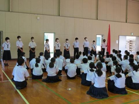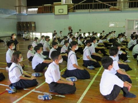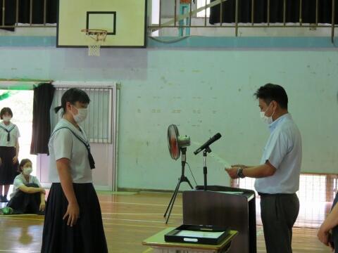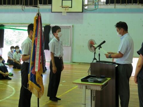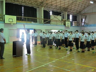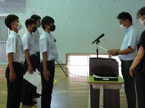 7月29日(水)、1学期前半終了の全校集会があり、明日から夏休みとなります。新学期から今まで、感染症対応による臨時休校や分散登校、3密を避ける対策をとるなどの、今までの日常とは考えられないような4ヶ月間でした。その中で、ほとんどの生徒が学習に部活動等に頑張っていたと思います。今日は、校長先生の話の後、学習面、生活面、保健面での話が担当の先生からありました。その後、先日行われた中体連大会の表彰がありました。明日から26日間の夏休みに入ります。ご家庭でもよろしくご指導をお願いします。