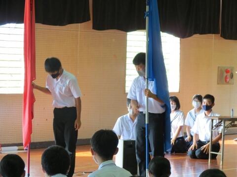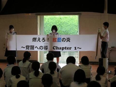 7月28日(水)、第74回体育大会に向けての結団式がありました。まず、生徒会から体育館のスローガンが発表され、思考が凝らした団色決定のあと、赤青の団が決まりました。本年度のスローガンは、「燃えろ!紅藍(こうらん)の炎 ~覚醒への導(しるべ) Chapter1~です。実行委員長、団長、副団長も決定し、みんなで一丸となって勝利を目指していきます。