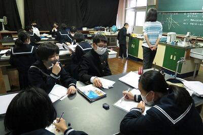 昨日、小林高校生による学習支援交流会が行われました。小林高校普通科探究科学コースの1・2年生が本校の3年生に数学と英語を教えてくれました。年の近い先輩たちとあって、すぐに打ち解けて楽しそうに学んでいました。本校生徒からは「すごく分かりやすかった。また来てほしい。」、「1時間があっという間に過ぎた。」、「高校生ってすごいな。頭がいいな。」という声が聞かれました。また、高校生は「最初、不安だったけど、細野中の生徒さんたちは素直で明るくて、安心しました。」と笑顔で優しく丁寧に教えてくれました。充実した学習会でした。