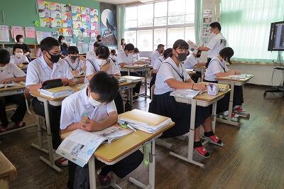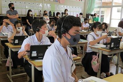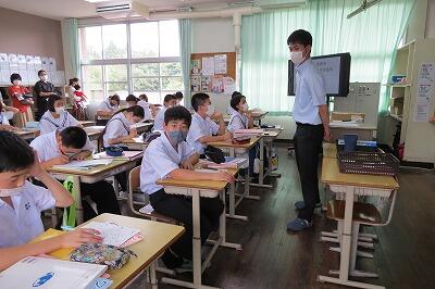 参観授業では、1年生が社会・数学、2年生が英語・理科、3年生が社会・保健の授業を実施しました。2年生の英語の授業ではタブレットPCを活用しました。GIGAスクールサポーターの上野さんにも授業に入ってもらい、操作の補助をしていただきました。