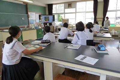 参観授業では、1年生が社会・数学、2年生が英語・理科、3年生が社会・保健の授業を実施しました。2年生の英語の授業ではタブレットPCを活用しました。GIGAスクールサポーターの上野さんにも授業に入ってもらい、操作の補助をしていただきました。
