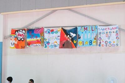↑ 各学級の学級旗 ↑ 各クラスの委員長等による学級紹介