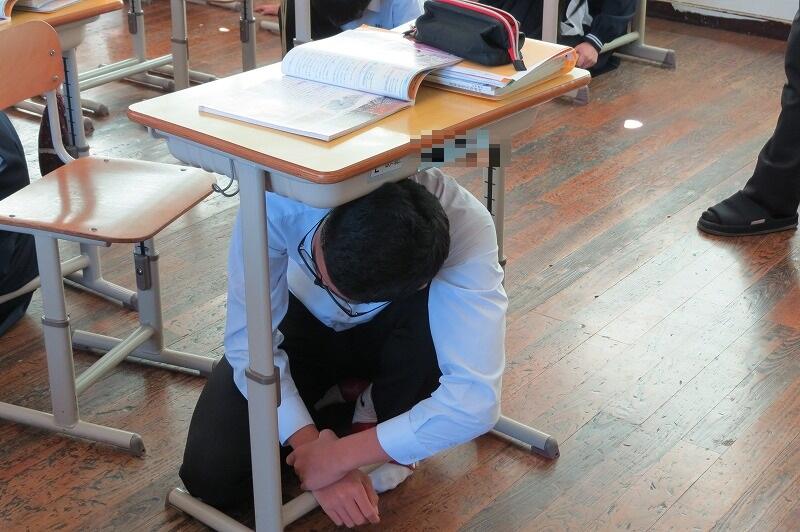当日は、授業中ではありましたが、緊急地震速報の放送にあわせて大地震の発生を想定し、机の下にもぐり、身を守る訓練を行いました。どの学年も素早く行動できていたようです。