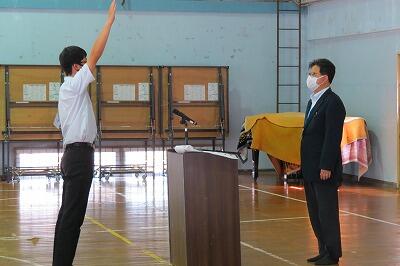 して生徒会代表が激励のことばを述べました。それを受けて、男子バレーボール部主将 木場 勇心さんが力強く選手