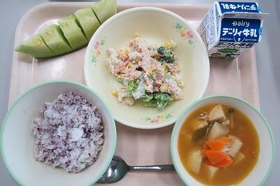 今日(6月9日)の給食は、ゆかりごはん、うま煮、花野菜サラダ、そしてメロン!このメロンは小林産とのこと。