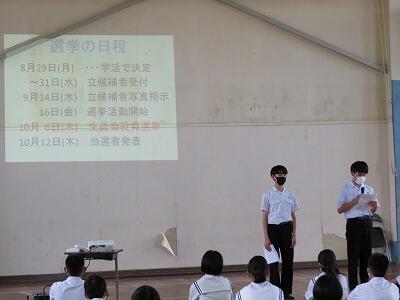 3年生を中心とした選挙管理委員会のみなさんが、選挙までの日程や細野中学校の生徒会に対する思いを伝えて