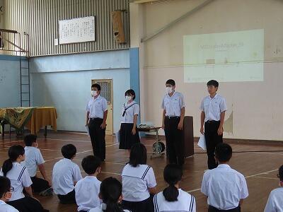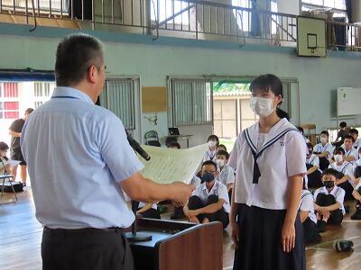 明日からいよいよ夏休みが始まります。夏休みを前に本日、「夏休み前集会」を行いました。夏休み中の過ごし方について、各担当より学習面、生活面、保健面について話をした後に、タブレットの持ち帰りについての指導も行いました。その後、選挙管理委員会よる生徒会役員選挙の説明があり、最後に表彰を行って集会を終えました。37日間、888時間の夏休み、一番大切なことは「命を守る」ことです。水難事故や交通事故には十分気を付けてほしいものです。124名全員が、充実した夏休みを過ごし、8月26日に元気よく登校してくれることを心から願っています。