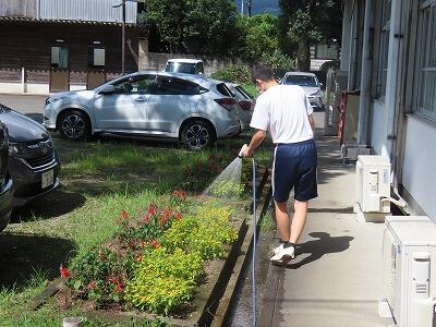3年生の教室をのぞいてみると、10名の生徒が勉強を頑張っていました、家で一人で勉強するより、学校でみんなと勉強するほうが効率が良いとのことです。昔から、「夏を制する者は受験を制す」と言われます。夢の実現に向けて頑張りましょう。一方、体育館とグランドでは部活動に取り組む姿が見られました。暑さ指数を気にしながらこまめに水分を補給して部活動に取り組んでいました。また、勉強に来ていた3年生2人がボランティアで花の水やりをしている場面にも遭遇しました。良い気分転換になったことでしょう。