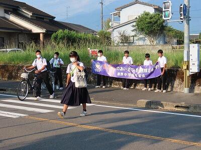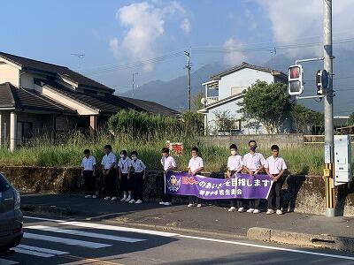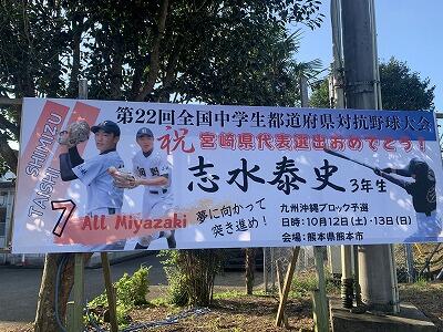 3年生軟式野球部の志水泰史くんが、「第22回全国中学生都道府県対抗野球大会」の宮崎県代表に選出されました。校門横の掲示板に、立派な横断幕が飾られています。県代表として堂々とプレイしてくれることを期待しています。また、校門近くの横断歩道では、野球部の後輩たちがあいさつ運動を行っていました。