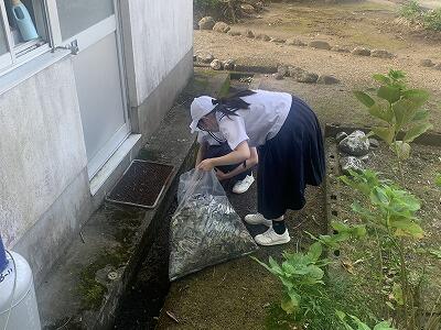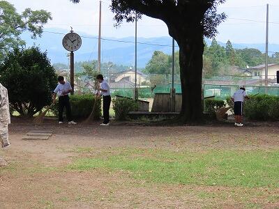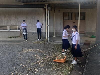 朝7時30分から、男子バレーボール部の生徒が竹ぼうきを手にボランティア作業を行い、男子ソフトテニス部の生徒はあいさつ運動を行っていました。一日の始まりです。生徒の皆さん、今日も楽しく学校生活を送りましょう。