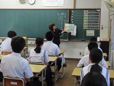 本日の5校時、「サラみやざき」の皆さんにお越しいただき、2年生に対して平和学習朗読劇「蒼天の向こうへ」を演じていただきました。2年生は12月に修学旅行を予定しており、広島の原爆資料館を訪れます。平和に関する意識を高めるための事前学習として本日の学習を計画しました。「サラみやざき」は、俳優・声優養成所でありながら、毎年、県内各地の中学校等で多数の公演をされています。