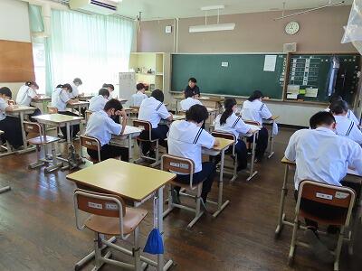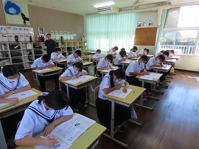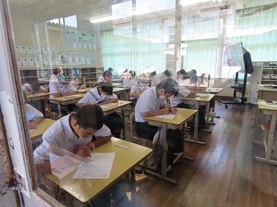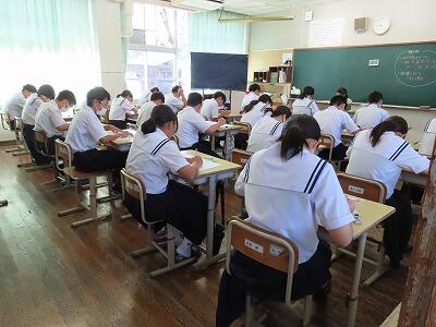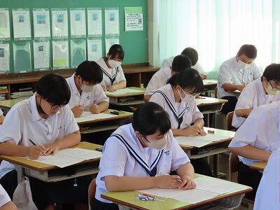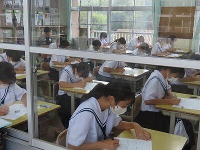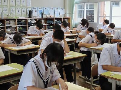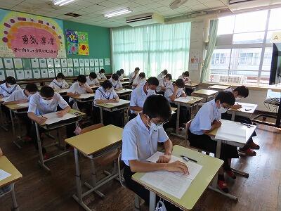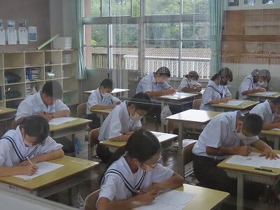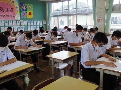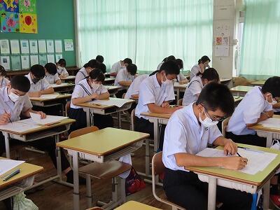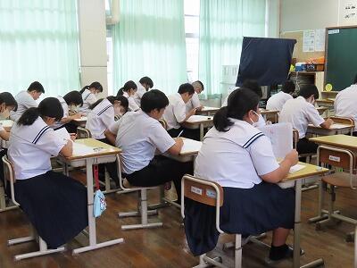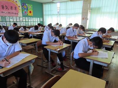 本日と明日にかけ、3年生第2回地区実力テストが行われます。今日は国語・理科・英語、明日は社会・数学が実施されます。写真は国語のテストを受けている様子です。今の自分の学力を知るための大切なテストです。3年生の健闘を祈ります。頑張ってください。