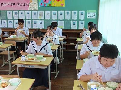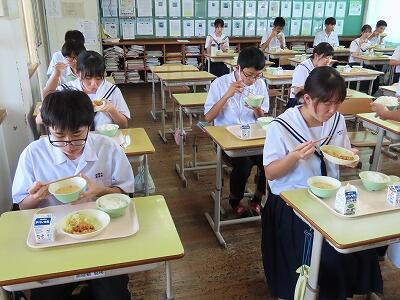 今日の給食のメニューは、「白ご飯・かきたま汁・鶏のから揚げ・添え野菜・牛乳」です。特に、鶏のから揚げは生徒にも好評です。しっかり給食を食べてエネルギーを充電し、午後からも頑張りましょう。