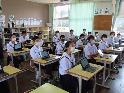 1年生の授業、英語と数学の様子です。英語では、辞書を使って単語調べの早さを競い合っていました。電子機器に頼らず紙の辞書を使って調べることも大切なことだと感じました。数学では、タブレットを使って「AIドリル」にチャレンジしていました。苦労しながらも楽しく活動することができていました。