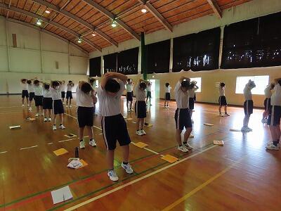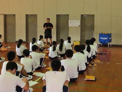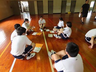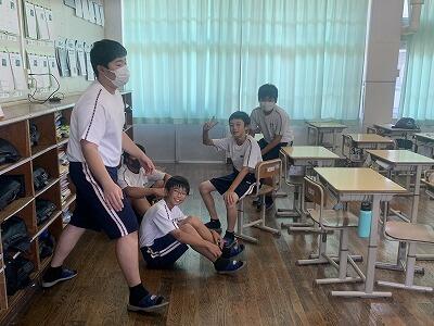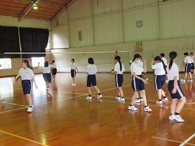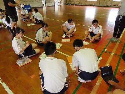 テストの終わった3時間目、3年生が地区体育館でバレーボールを行っていました。準備運動の後に、チームごとにパス練習やスパイク練習、サーブ練習を行いました。その後チームごとに集まり、全員が楽しめるルール作り(競争性を保ちながらの)を行いました。また、チームとして盛り上がるための対策についても話し合う様子が見られました。その後試合を行い、終わった後は再び話し合いをし、反省を生かし改善点について考えました。得意な人や苦手な人が皆楽しめるルール作りは大変そうでしたが、共生の視点を大切にしながら話し合いを行うことができました。さすが3年生だと感じさせられました。