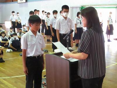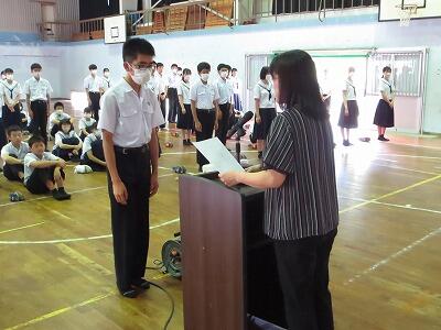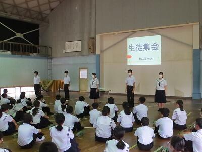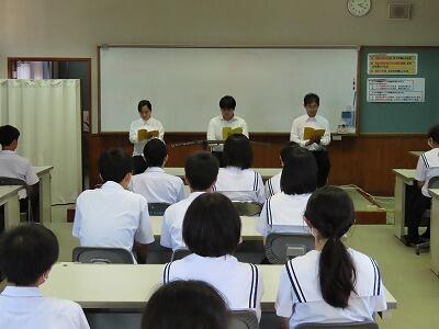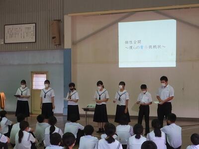 9月9日(月)の6時間目終了後、生徒集会を行いました。内容は、全校専門委員会の報告と文化発表会のスローガン説明、表彰でした。全校専門委員会の報告では、各全校専門委員長が具体的な取組事項についての説明を行いました。次に、文化発表会実行委員会によるスローガン発表です。今年度の文化発表会は、10月25日(金)の午後行いますが、スローガンは「個性全開~ぼくらの青春挑戦状~」です。素晴らしいスローガンに決まりました。文化発表会の成功を祈ります。また、表彰では、実用英語技能検定や日本漢字能力検定、ボランティア活動など多数の生徒が表彰されました。表彰された生徒の皆さん、おめでとうございます。今後も継続した取組に期待します。