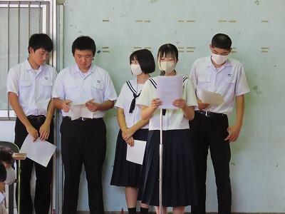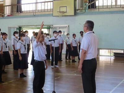 本日、西諸県地区中学校秋季体育大会の壮行式を行いました。初めに、各部活動の抱負を述べた後、生徒代表激励の言葉、校長激励の言葉、選手宣誓と続きました。各部活動の抱負では、「優勝して県大会に行きたい」「ペアで協力して良い結果を出したい」「練習の成果を十分発揮し悔いのない大会にしたい」など堂々と発表する姿が見られました。生徒代表激励の言葉や選手宣誓ではどちらも、「今まで支えてくださったすべての方々への感謝を忘れず」という表現が見られました。まさにその通りです。細野中学校の代表として胸を張って大会に臨んでください。健闘を祈ります。