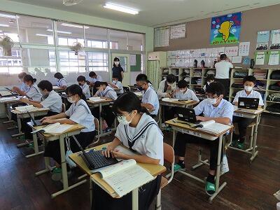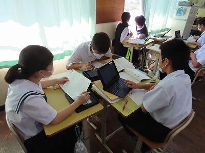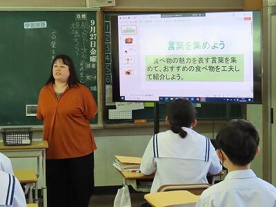 本日の1年生国語の授業は、「言葉を集めよう」という単元で、「食べ物の魅力を表す言葉を集めて、おすすめの食べ物の紹介文を書く」という内容でした。自分が紹介する食べ物を決めた後に、4つの観点(見た目・味・食感・香り)を意識して紹介したい食べ物についてまとめていきました。タブレットを使ったり友達と意見を交換したりして授業が進んでいきました。苦労しながらも自分なりの紹介文を作成していました。