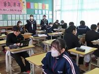 本日の2時間目の授業の様子です。1年生は体育、2年A組は英語、B組は理科、3年生は総合的な学習の時間及び卒業アルバム用個人写真撮影です。集中して授業に取り組んでいます。