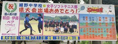 7月に開催される県中学校総合体育大会ソフトテニス競技の個人戦に女子ソフトテニス部の1ペアが出場します。大会出場を記念して横断幕を設置していただきました。応援していただいた多くの方々への感謝を忘れず大会で活躍してほしいと思います。