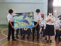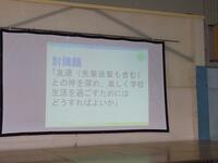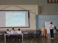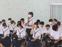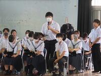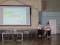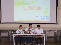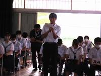本日の1・2時間目に生徒総会を行いました。当初の予定では5・6時間目に開催予定でしたが、暑さを考慮し少しでも涼しい朝の時間帯で実施しました。開会宣言を行った後に、生徒会長あいさつ、諸注意と続き議長団選出を行いました。議長団は3名の3年生です。生徒会活動報告や会計報告、生徒会活動計画案や予算案及び今年度の生徒会スローガン並びに委員会活動についての提案を行いました。今年度の生徒会スローガンは、「和顔愛語」です。意味は、穏やかな笑顔と思いやりのある言葉で人に接するということです。素晴らしいスローガンになりました。その後、全校討議を行いました。討議題は、「友達(先輩後輩も含む)との仲を深め、楽しく学校生活を過ごすためには」でした。各学級から様々な意見が出されていました。今後も、みんなが安心して楽しく過ごせる学校であることを期待しています。