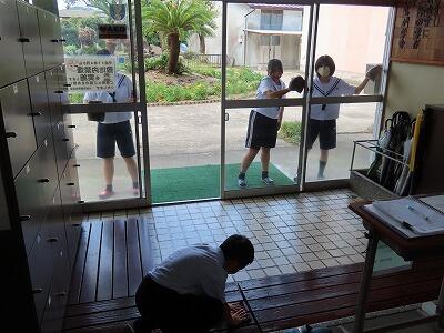 45分間の昼休みが終わり、13時55分から10分間の掃除が始まります。開始時刻の5分前には清掃場所に集合し、今日の目標を確認した後、掃除を始めます。自主的に取り組む様子が数多く見られます。