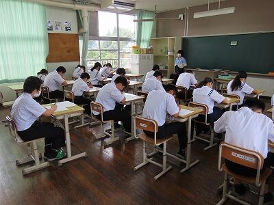 今日は第2回定期テスト最終日です。1年生は理科・国語、2年生は英語・理科、3年生は社会です。最後までしっかりテストを受けていました。テストが終わると気が抜けてしまいがちですが、テストは終わってからどのように学習に取り組むかが大切です。テスト結果から判明した自分の苦手分野の克服に全力で取り組んでほしいものです。