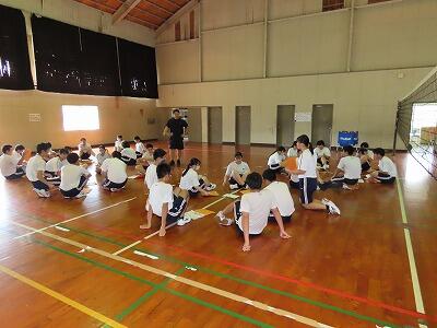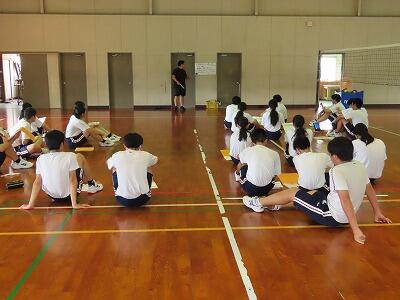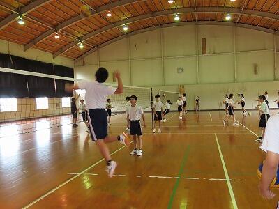テストの終わった3時間目、3年生が地区体育館でバレーボールを行っていました。準備運動の後に、チームごとにパス練習やスパイク練習、サーブ練習を行いました。その後チームごとに集まり、全員が楽しめるルール作り(競争性を保ちながらの)を行いました。また、チームとして盛り上がるための対策についても話し合う様子が見られました。その後試合を行い、終わった後は再び話し合いをし、反省を生かし改善点について考えました。得意な人や苦手な人が皆楽しめるルール作りは大変そうでしたが、共生の視点を大切にしながら話し合いを行うことができました。さすが3年生だと感じさせられました。