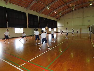 テストの終わった3時間目、3年生が地区体育館でバレーボールを行っていました。準備運動の後に、チームごとにパス練習やスパイク練習、サーブ練習を行いました。その後チームごとに集まり、全員が楽しめるルール作り(競争性を保ちながらの)を行いました。また、チームとして盛り上がるための対策についても話し合う様子が見られました。その後試合を行い、終わった後は再び話し合いをし、反省を生かし改善点について考えました。得意な人や苦手な人が皆楽しめるルール作りは大変そうでしたが、共生の視点を大切にしながら話し合いを行うことができました。さすが3年生だと感じさせられました。