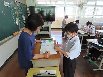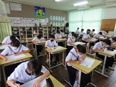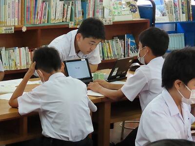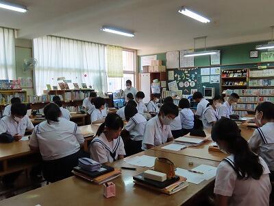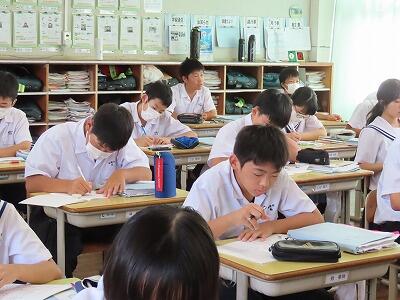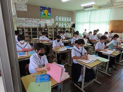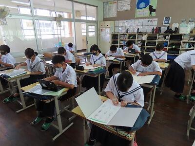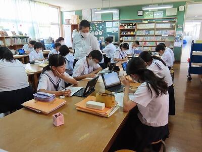 本日3校時に行われた2年B組の国語の授業の様子です。単元名は「多様な方法で情報を集めよう」で、本時の目標は「職場体験学習に係る活動を通して集めた情報を分類・整理する」です。初めに、集めた情報を確認し、学習の見通しを持った後、資料作成に必要な情報の決定を行いました。個別にじっくり考え、その後複数人で意見を交換する活動を行いました。情報の真偽を確かめ、必要な情報を収集し選別する能力は今後ますます大切になります。国語のみならず様々な授業で将来必要となる力を身につけてほしいと思います。