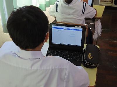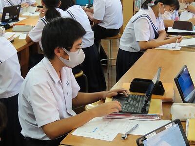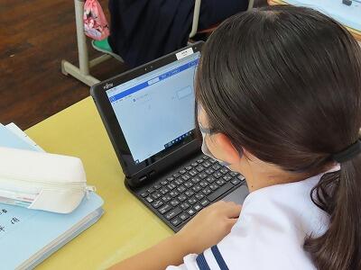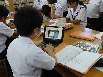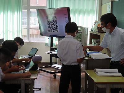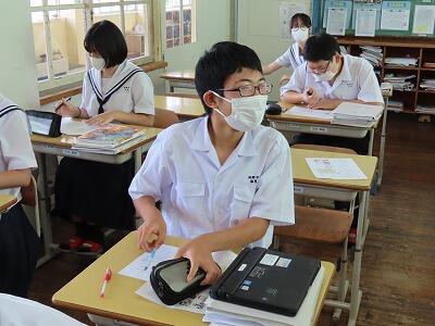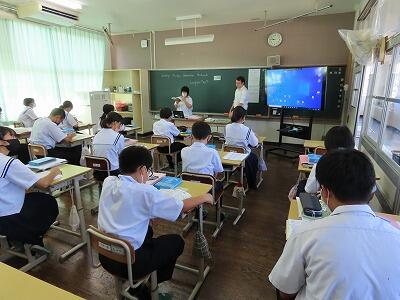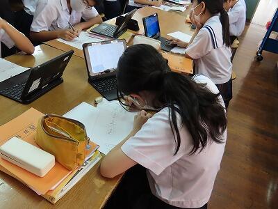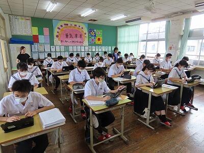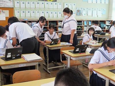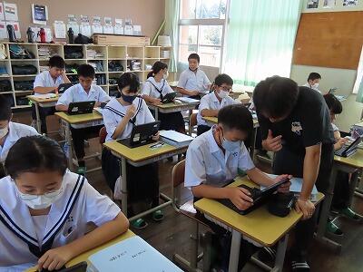 1年生の授業、英語と数学の様子です。英語では、辞書を使って単語調べの早さを競い合っていました。電子機器に頼らず紙の辞書を使って調べることも大切なことだと感じました。数学では、タブレットを使って「AIドリル」にチャレンジしていました。苦労しながらも楽しく活動することができていました。