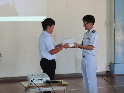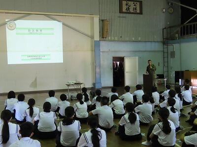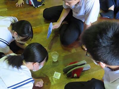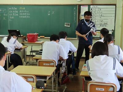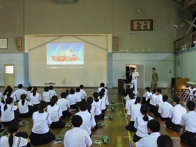 本日の5・6時間目に、全校生徒を対象に防災教育を行いました。自衛隊宮崎地方協力本部小林地域事務所の方々にお越しいただき講話をしていただきました。初めに、能登半島地震について被害状況や自衛隊の派遣状況についての話を聞き理解を深めました。また、宮崎県内に大きな被害をもたらした台風10号や地震についても話をしていただきました。災害への備えを考えるとき、「自助」「共助」「公助」の中でも「自助」「共助」がとても重要であるということを学ぶことができました。講話の後は、「南極の氷を体験してみよう」ということで、砕氷艦「しらせ」が持ち帰った本物の南極の氷と普通の氷との違いを体験する活動を行いました。興味深く活動している姿が印象的でした。自衛隊の皆様、本日はありがとうございました。