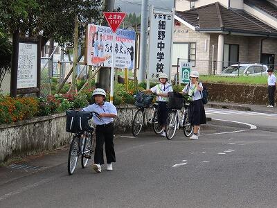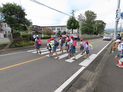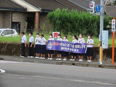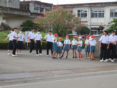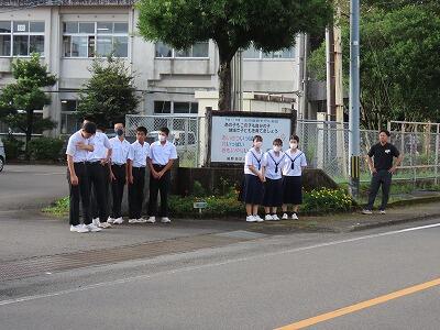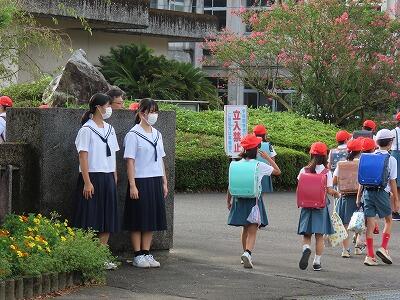 本日3回目の小中合同あいさつ運動を行いました。小学生が元気よく集団で登校してきます。横断歩道を渡るとき、手を挙げて渡り、渡り終えてから信号待ちをしている車に向けてお辞儀をする姿が微笑ましいです。