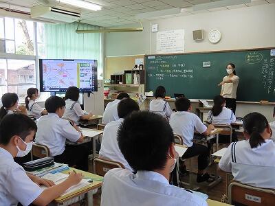 1年A組は美術、B組は英語です。2年A組は理科、B組は技術です。3年A組は社会です。C組も社会です。それぞれの授業に生き生きと取り組む様子が見られます。