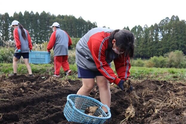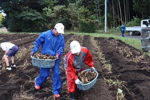 2年生が技術の授業にて、5月に苗切りを行い、6月に苗植えをしたさつまいも。11月20日午後の技術の授業で、収穫を行いました。