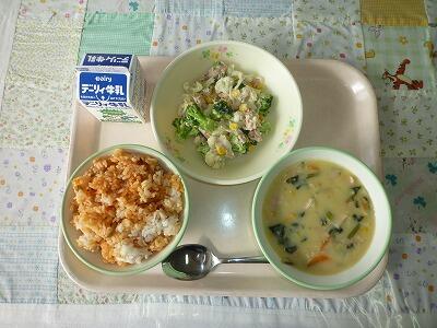 チキンライス&野菜のコーンスープ&花野菜のサラダ
