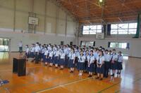 5月26日(月)に「地区中総体推戴式」を行いました。出場するのは、「女子バレーボール部」「軟式野球部」「陸上競技部」「弓道競技」「卓球競技」の5種目です。どの競技も、キャプテンを中心に大きな声で大会の抱負を発表してくれました。自身に満ち溢れた様子から、日々の練習がいかに充実しているかを感じさせます。抱負発表の後には、校長より大会参加へ向けて、とにかく大会を楽しむこと、平常心を保つために「慌てないこと」「焦らないこと」「あきらめないこと」等の激励のことばが送られました。3年生にとっては、最後の地区中総体となります。悔いのないよう全力で頑張ってくれるものと思います。