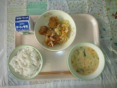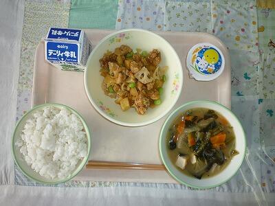 鶏肉とサツマイモの揚げ煮&ほうれん草の味噌汁&お月見デザート