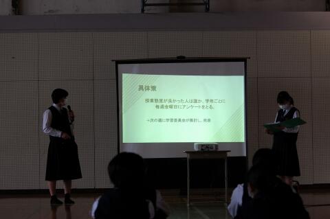 生徒指導の先生と生活保体委員会を中心にした、礼法指導がありました。あいさつを行う際にはどのように行うとよいか、制服をどのように着こなすかなど、良い例と悪い例を示し、実演し、新1年生にも分かりやすいものでした。