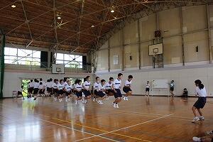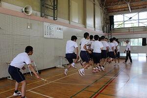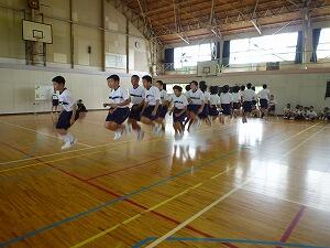 体力向上を目的として、校歌にある「無限の力」と題して、年4回実施しています。今回は、第1回目として、大縄跳びを行いました。予選会では、男女別に跳んだ回数の合計で順位を付け、決勝で跳ぶ順番が決まります。1年生は初めてで、難しそうでした。決勝は、男女一緒に跳んだ回数を競いました。予選会。