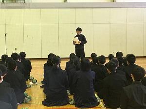 朝の全校集会では、体育館に集合するまで無言移動です。生徒会役員が「無言で移動しましょう」というプラカードを示しています。静かな移動です。