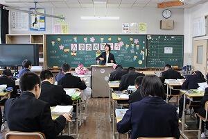 入学式後、教室では、担任の先生から明日から始まる中学校生活の話がありました。ここでも、緊張した面持ちでした。