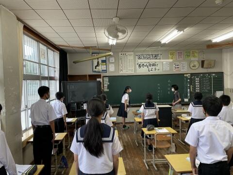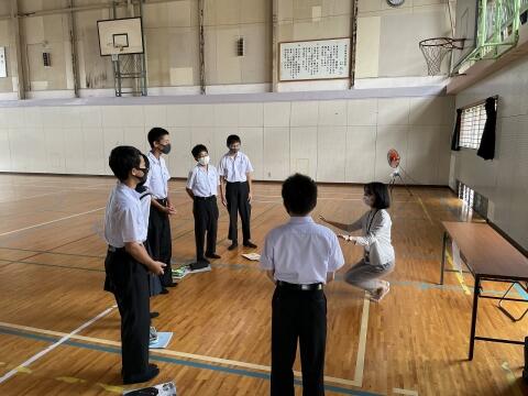 今回の学習の目的は、7月にある職場体験に向けて基本的な礼儀作法を身に付けることです。大きな声で明るくあいさつする、礼をすることは職場だけではなく、日常生活においてもとても大切なことです。生徒も、楽しみながら活動できたようです。