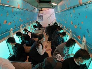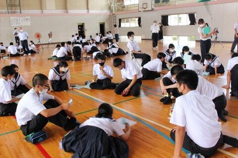 生徒総会で採決された3学年の縦割り班に分かれ動画の感想と