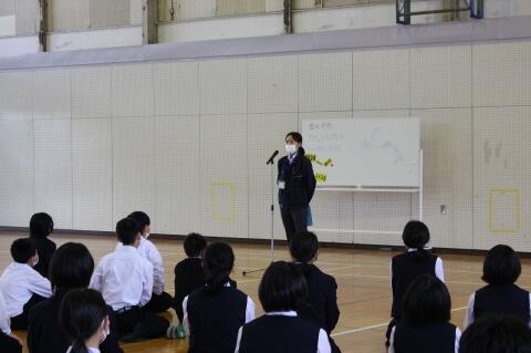 生徒指導の先生と生活保体委員会を中心にした、礼法指導がありました。あいさつを行う際にはどのように行うとよいか、制服をどのように着こなすかなど、良い例と悪い例を示し、実演し、新1年生にも分かりやすいものでした。