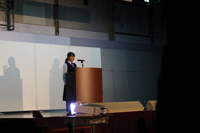 生徒会代表、下沖彩乃さんは「生徒会役員として、生徒総会や体育大会など全校生徒が楽しめるよう工夫してきたこと、今後も全校生徒がより良い学校生活を過ごせるように努力していくこと」を述べました。