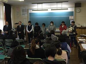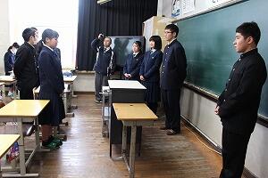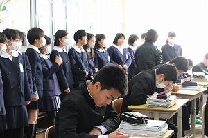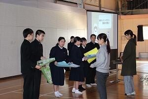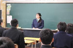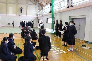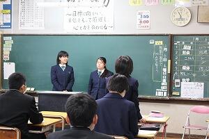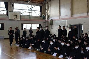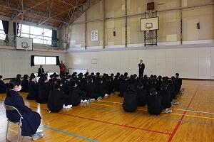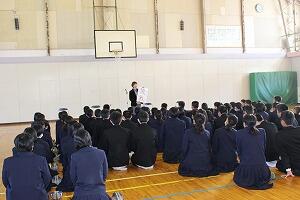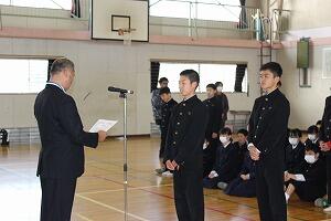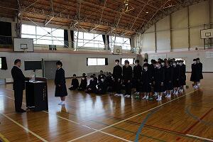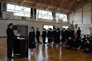 冬休みが終わり学年末最後の3ヶ月が始まりました。各学年代表が、学習面や生活面、受験や進路について発表しました。山之口校長からは、今年は年号も変わる年であり、何かに挑戦してほしいと話がありました。