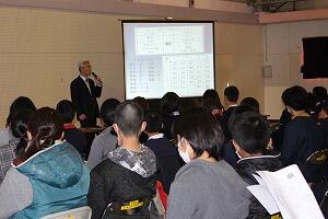 2年生が将来に向けて、志を一文字の漢字で表し決意表明をしました。いろいろな困難に負けず頑張ってほしいものです。その後、元県北部福祉子どもセンター所長 林豊和氏に「自立について」の講演をしていただきました。